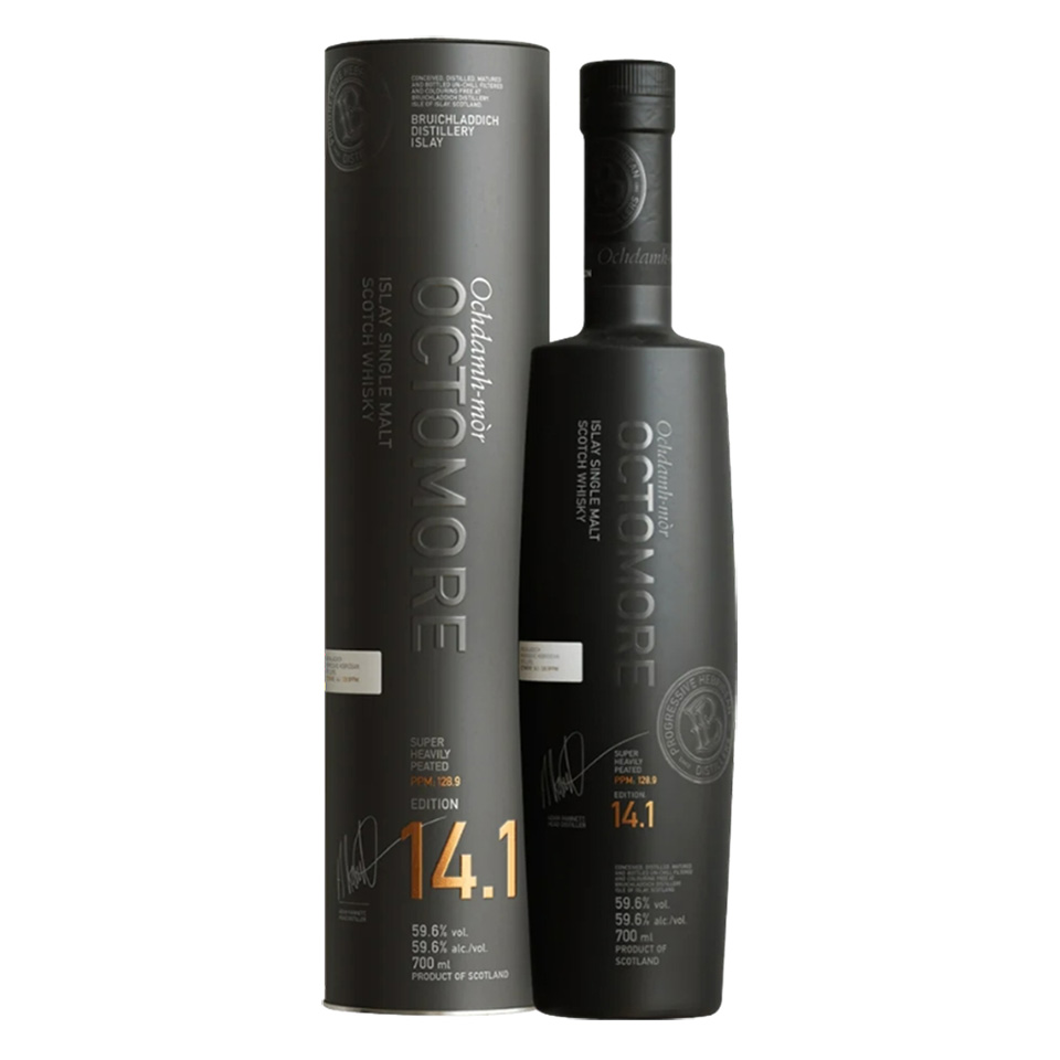 Octomore regresa con otra gama de whiskies extremadamente turbosos que han sido envejecidos durante al menos cinco años y embotellados casi a la fuerza del barril. Octomore 14.1 5 Year Old se destiló con cebada 100% escocesa malteada a un intenso nivel de 128.9 ppm y maduró en barricas de whiskey americano de primer llenado. El objetivo de esta expresión era aportar una influencia sutil del roble para permitir que el carácter crudo y ahumado del espíritu brillara.